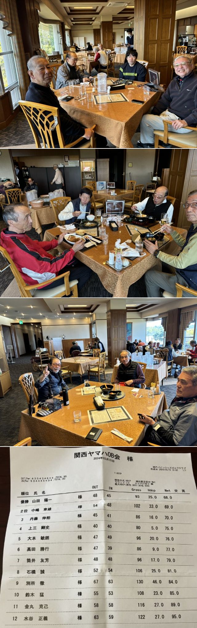 栄えある入賞には、OB会コンペには久々の参加ながら日頃は真面目に練習を積み重ねられていることが想像できるようなスコアで吉井幹也さんが優勝、不断の努力で回を重ねるたびに着実にスコアを伸ばしてきている中嶋章雄さんが2位となりました。一方、努力とは無縁にて能書きと講釈がメインの鈴木、石橋、金丸の三氏は低位に沈んでおります。