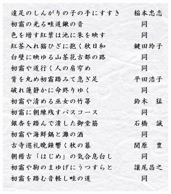 ・内容 各自が兼題、「初霜」、「山茶花」及び雑詠の計6句を提出。