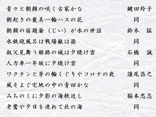 東日本・中部・関西地区それぞれで俳句サークルが活動されており、コロナ禍という環境もあってメールを活用しての合同企画の実施となりました。3地区共に営業系、転勤族が比較的多く在籍しており下記の選ばれた方にも皆さんご存じの方もおられると思います。