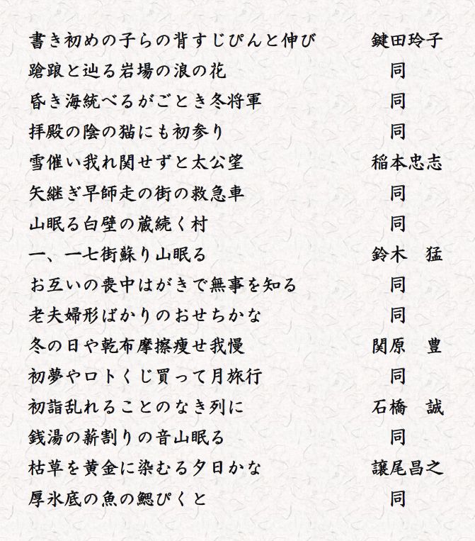 内 容 各自が兼題、「山眠る」「冬日」及び雑詠の計6句を用意した。
