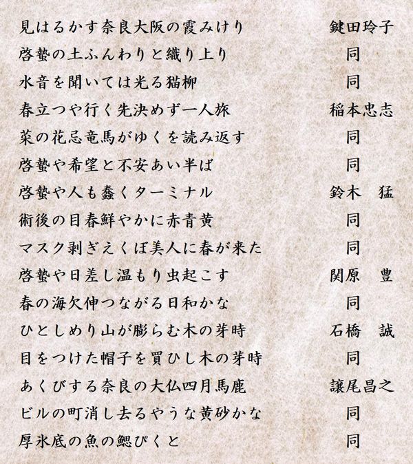 内 容 各自が兼題、「啓蟄」「四月馬鹿」及び雑詠の計6句を用意した。