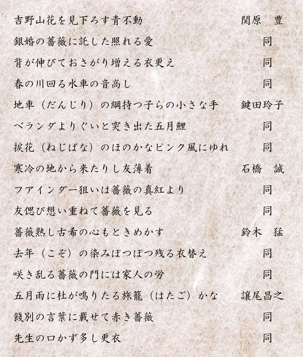 内容 各自が兼題、「更衣」「薔薇」及び雑詠の計6句を用意した。