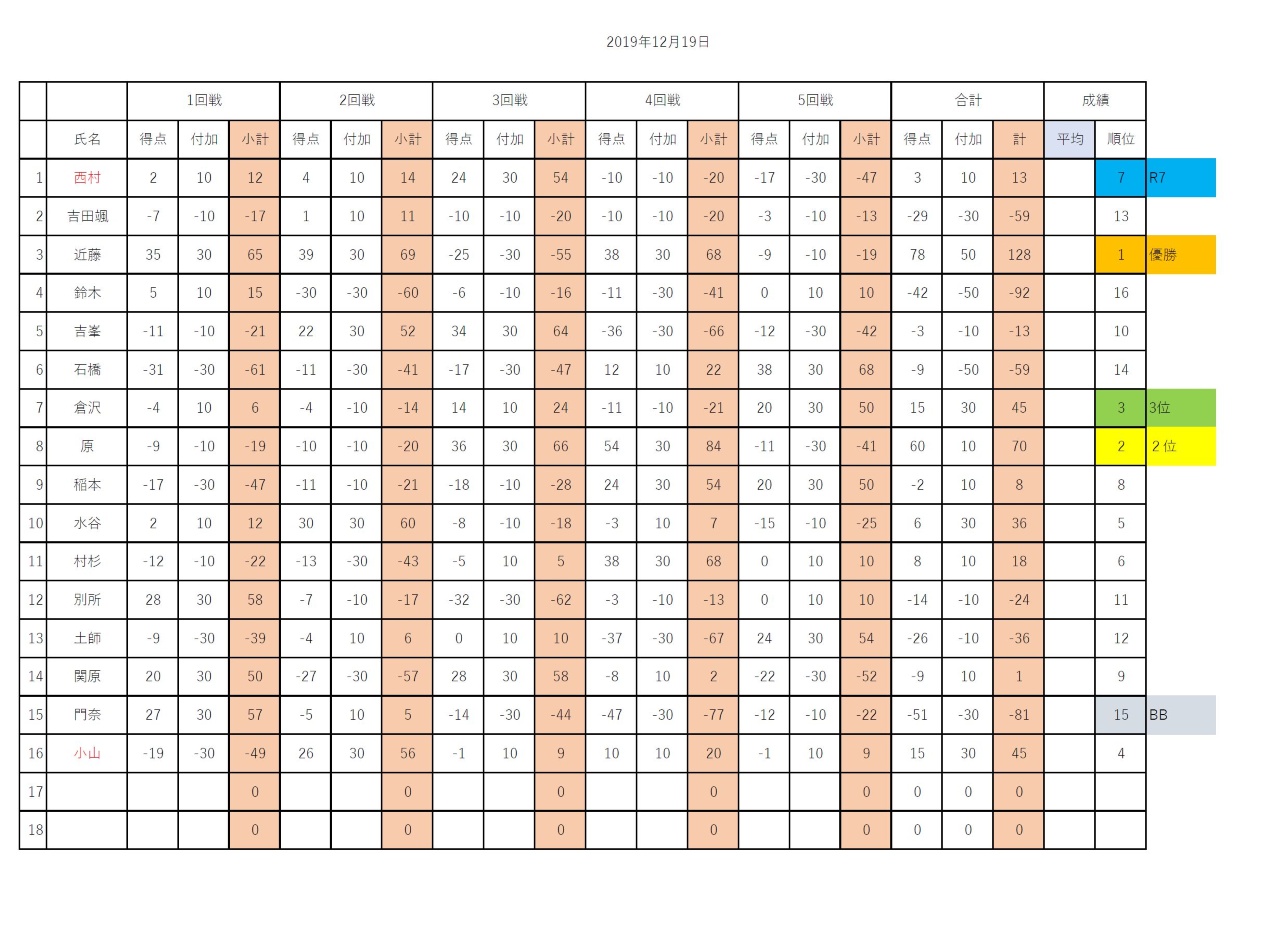 5回戦を戦い抜き優勝を手にしたのは稲本氏でした。時間の経つのが早いと感じるのはみんながゲームに没頭している証拠。頭の体操と手先を使い素晴らしい時間を過ごしました。今回初参加の正井さんは、ゲームの楽しさを思い出したようで、成績はよくありませんでしたが、これからも出席して欲しいメンバーです。当日朝、吉峰さんが腰の調子があまりよくないと連絡があり棄権されましたが、賛助会員のおかげで人数を揃えることが出来ました。
