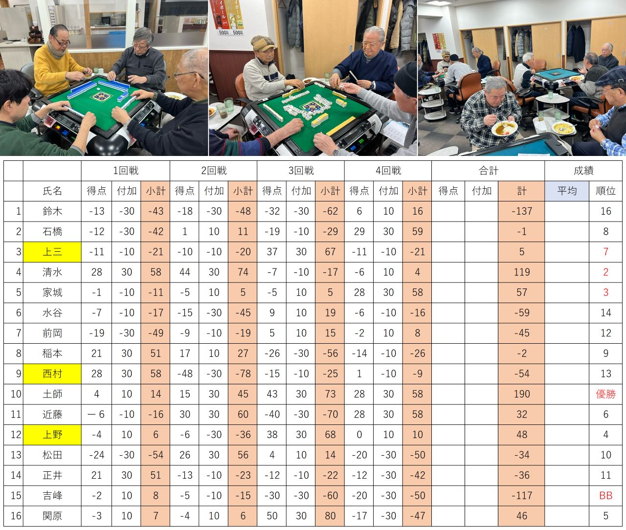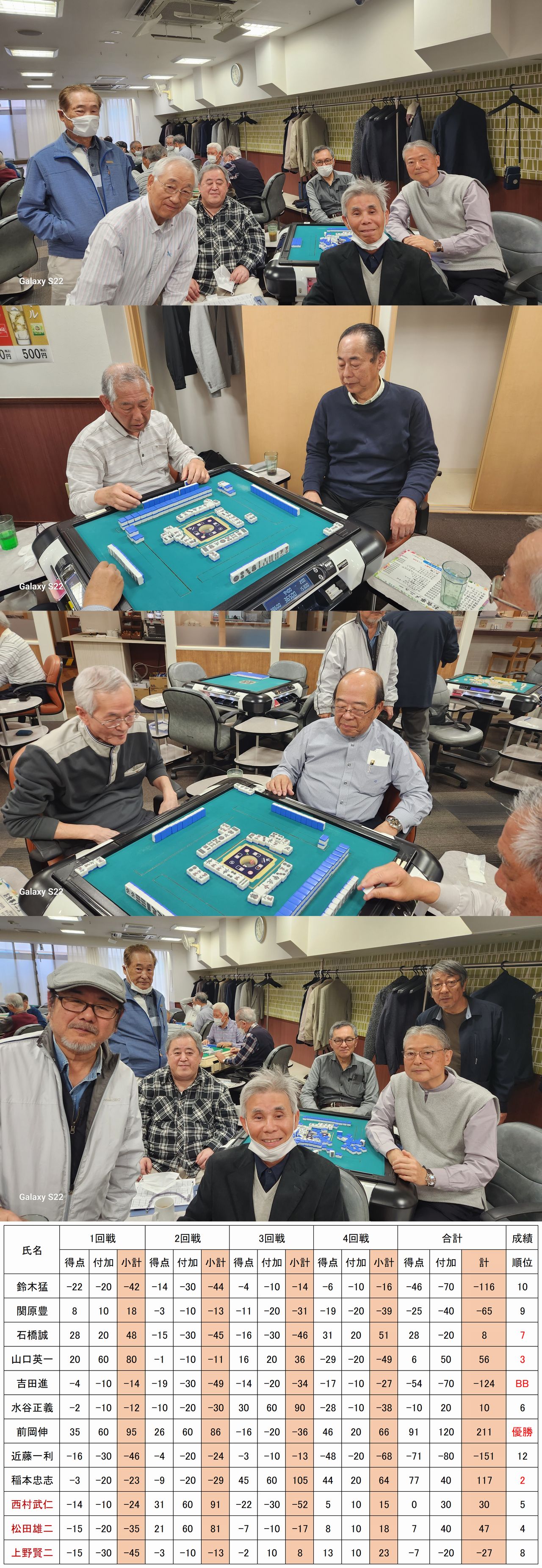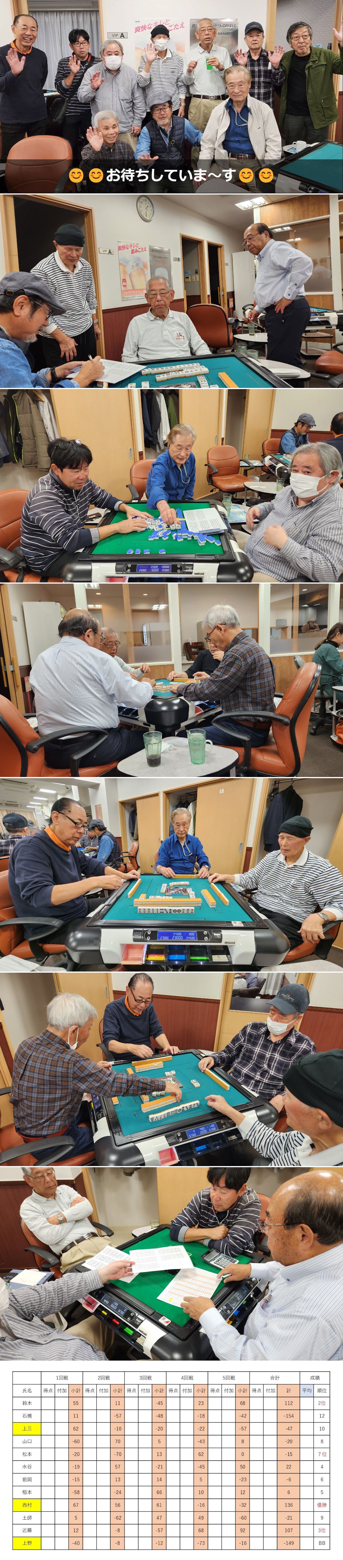 5回戦を戦い抜き優勝を手にしたのは西村氏でした。鈴木さんが2位、3位は近藤さんでした。ラッキーセブン賞は松本さん、上野さんがBB賞を獲得しました。時間の経つのが早いと感じるのはみんながゲームに没頭している証拠。頭の体操と手先を使い本当に健康麻雀は楽しいと感じました。現在年4回ですが、年6回くらいは出来そうです。