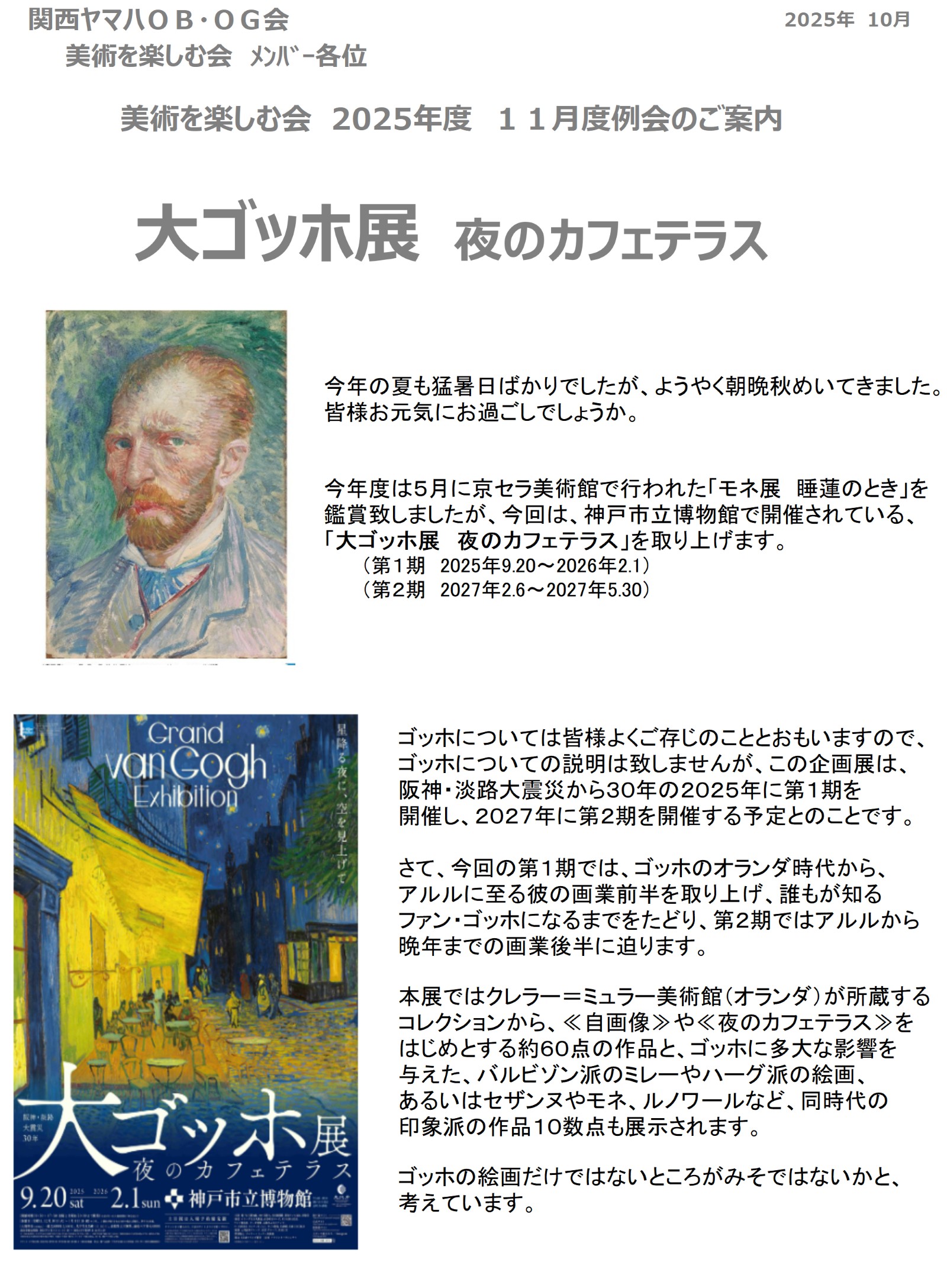 美術を楽しむ会 11/11(火)神戸市立博物館「大ゴッホ展」のお誘い