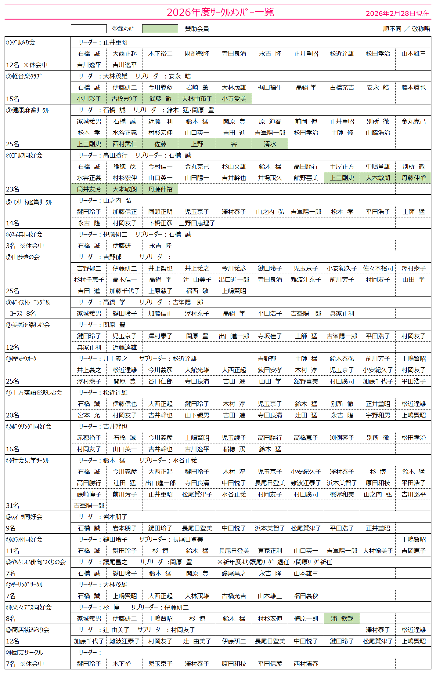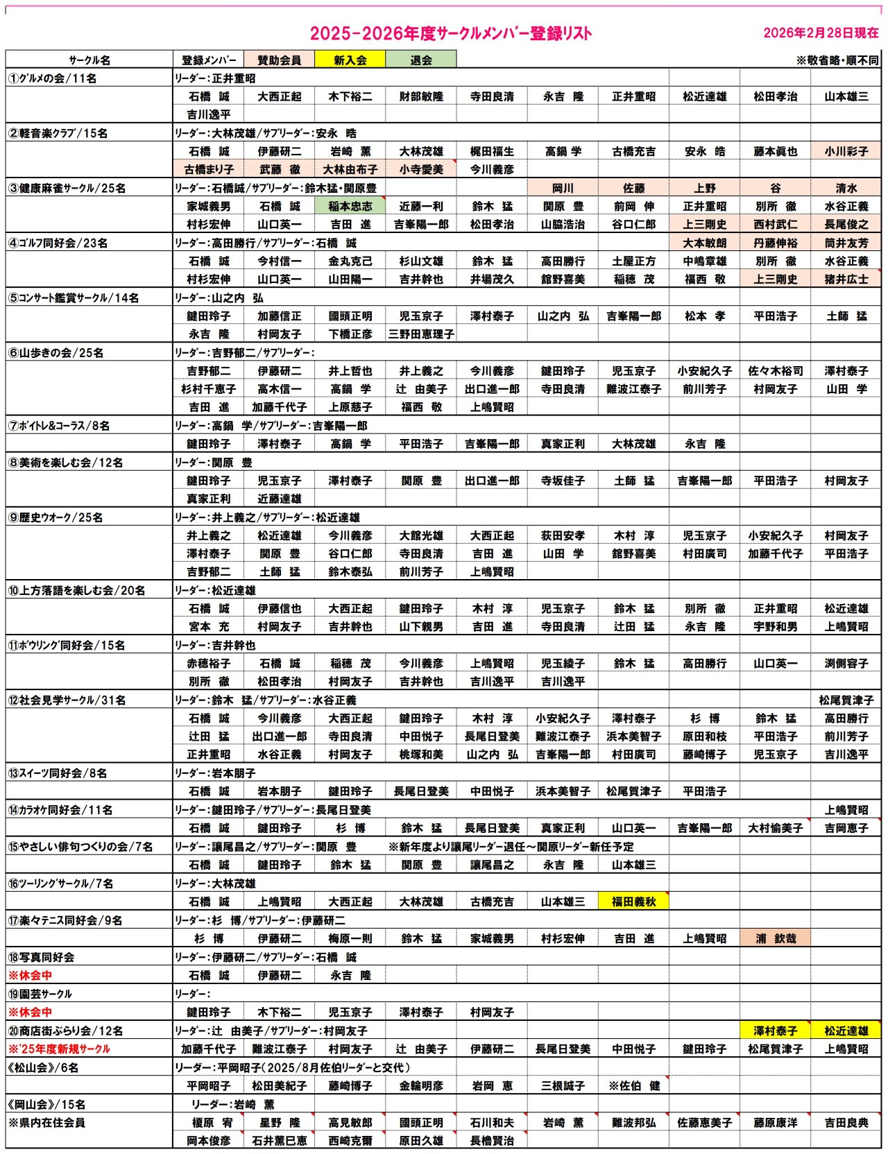 ※各サークル登録者一覧はこちら → サークルメンバー表 2026年2月28日現在