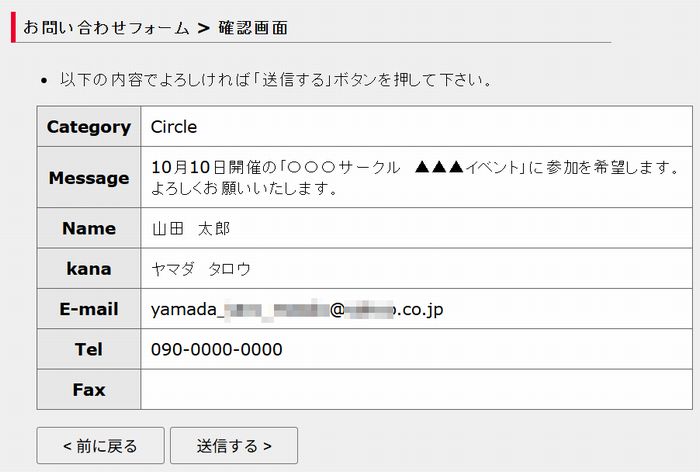 修正する場合は「前に戻る」をクリックして修正後に再度送信ボタンを押してください。