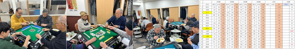5回戦を戦い抜き優勝を手にしたのは西村氏でした。鈴木さんが2位、3位は近藤さんでした。ラッキーセブン賞は松本さん、上野さんがBB賞を獲得しました。時間の経つのが早いと感じるのはみんながゲームに没頭している証拠。頭の体操と手先を使い本当に健康麻雀は楽しいと感じました。現在年4回ですが、年6回くらいは出来そうです。