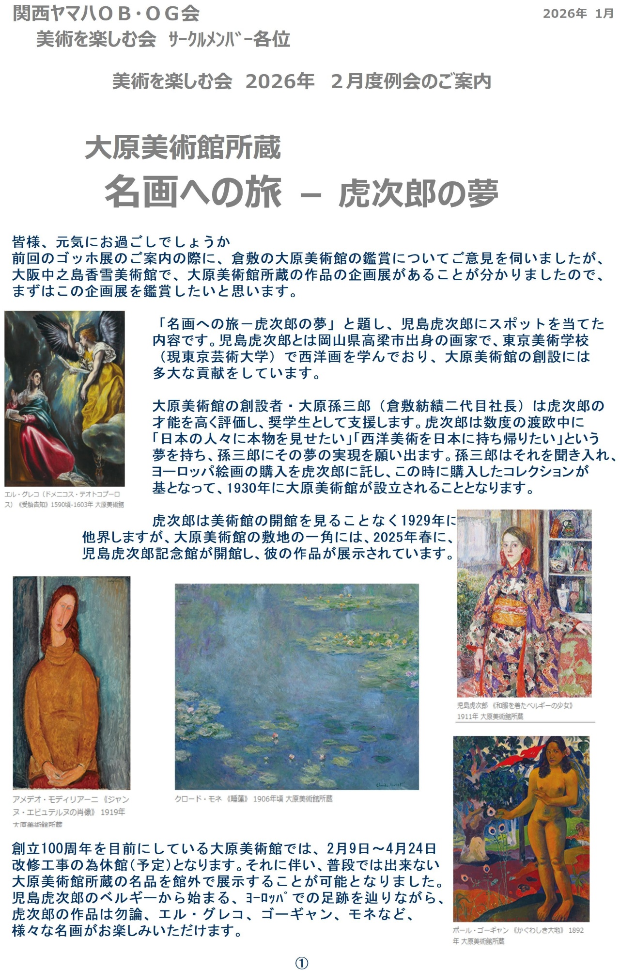 美術を楽しむ会 2/19(木)大原美術館所蔵名画への旅~のご案内