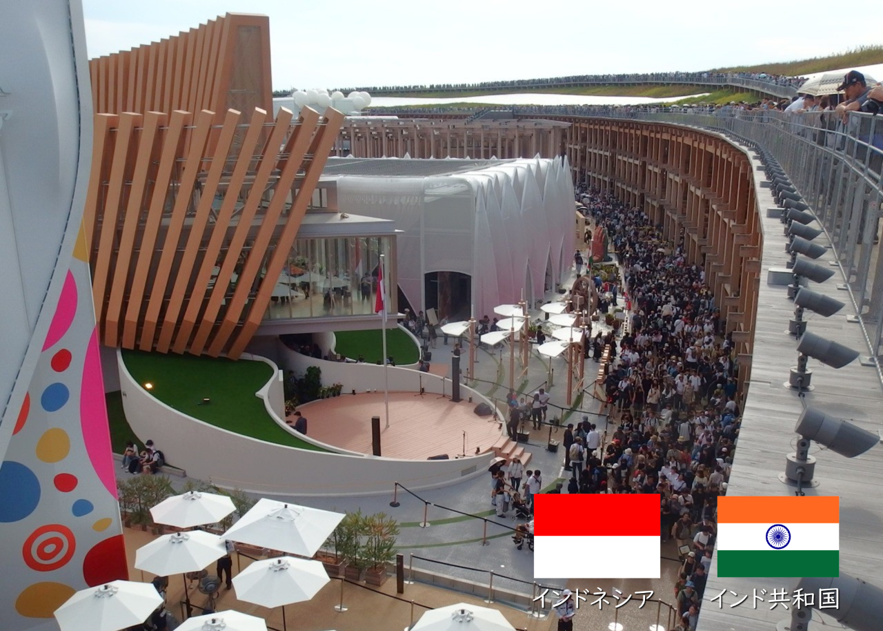 他のパビリオンを覗いてみるも「3時間待ち」とか「4時間待ち」・・(泣。 取り敢えず大屋根リングに登ってパビリオンを外から楽しむ戦略に変更!