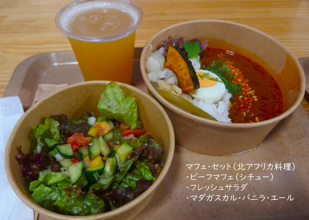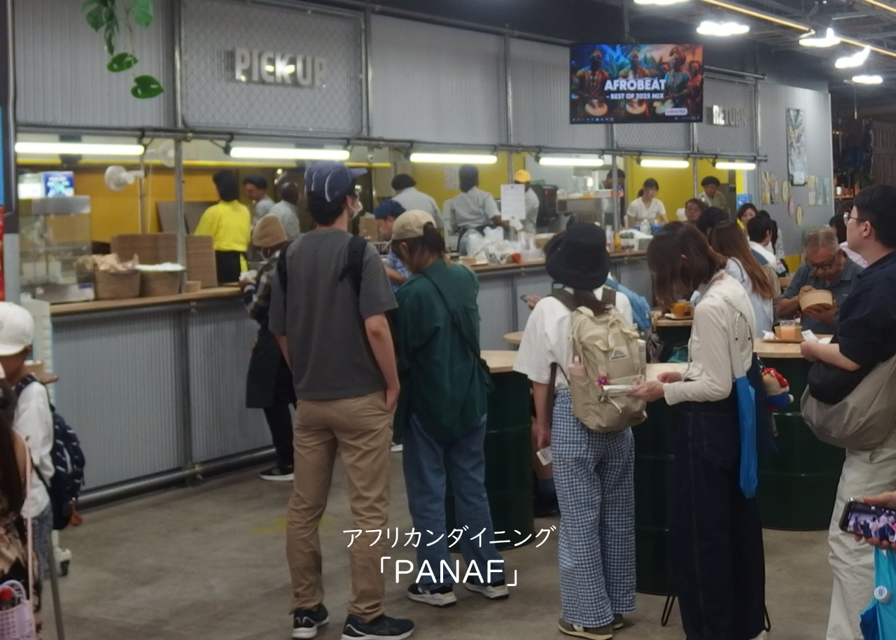 その後はウォータープラザで休憩したりシグネチャーパビリオンの外観を眺めたりしながら、お腹も空いてきたのでマーケットプレイス東にあるアフリカンダイニングの「PANAF」に行ってみたら、30分待ちとの事で行列に並びます。大阪弁の上手なアフリカ?の店員さんと会話しながら、気になっていたアフリカンフードを注文してクラフトビールと共にスパイシーな香りを楽しみました。