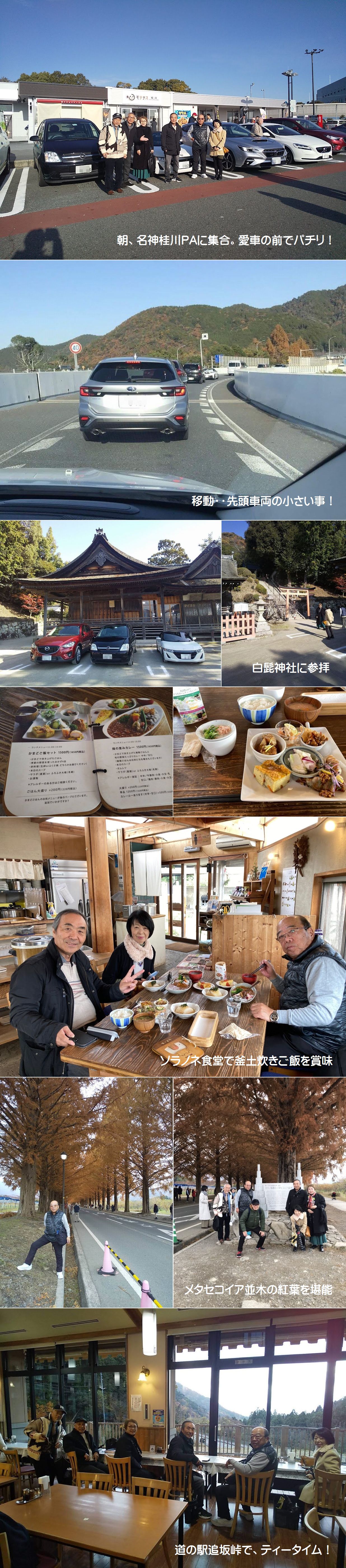 今回の行先は四季折々の表情を見せるメタセコイア並木がメインの行程でした。メタセコイア並木の紅葉を堪能でき景色は楽しめたのであったが、如何せん人混みでいっぱいなのでゆったりした時間は持てず、次の道の駅にてようやく小休止ができたのでした(^^♪